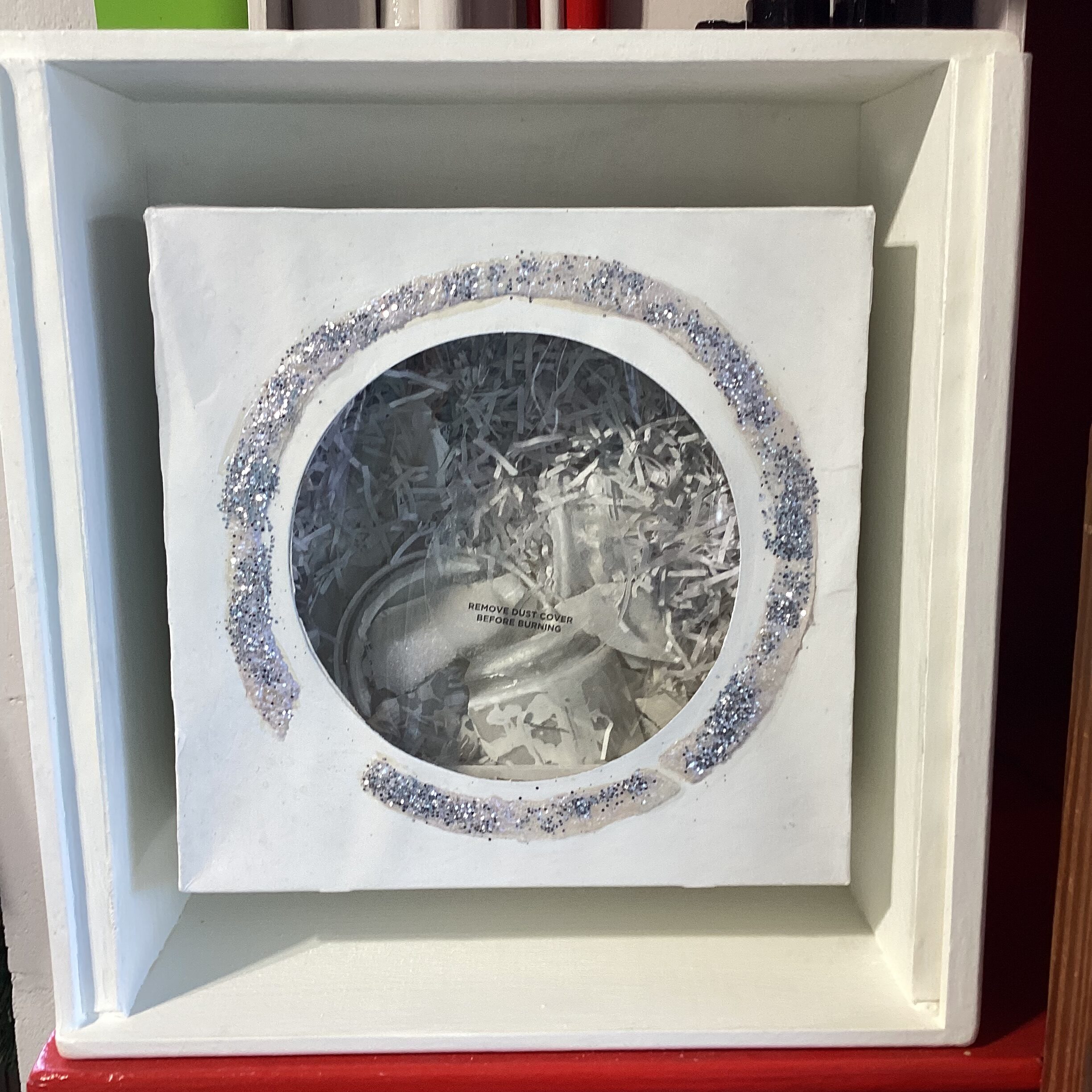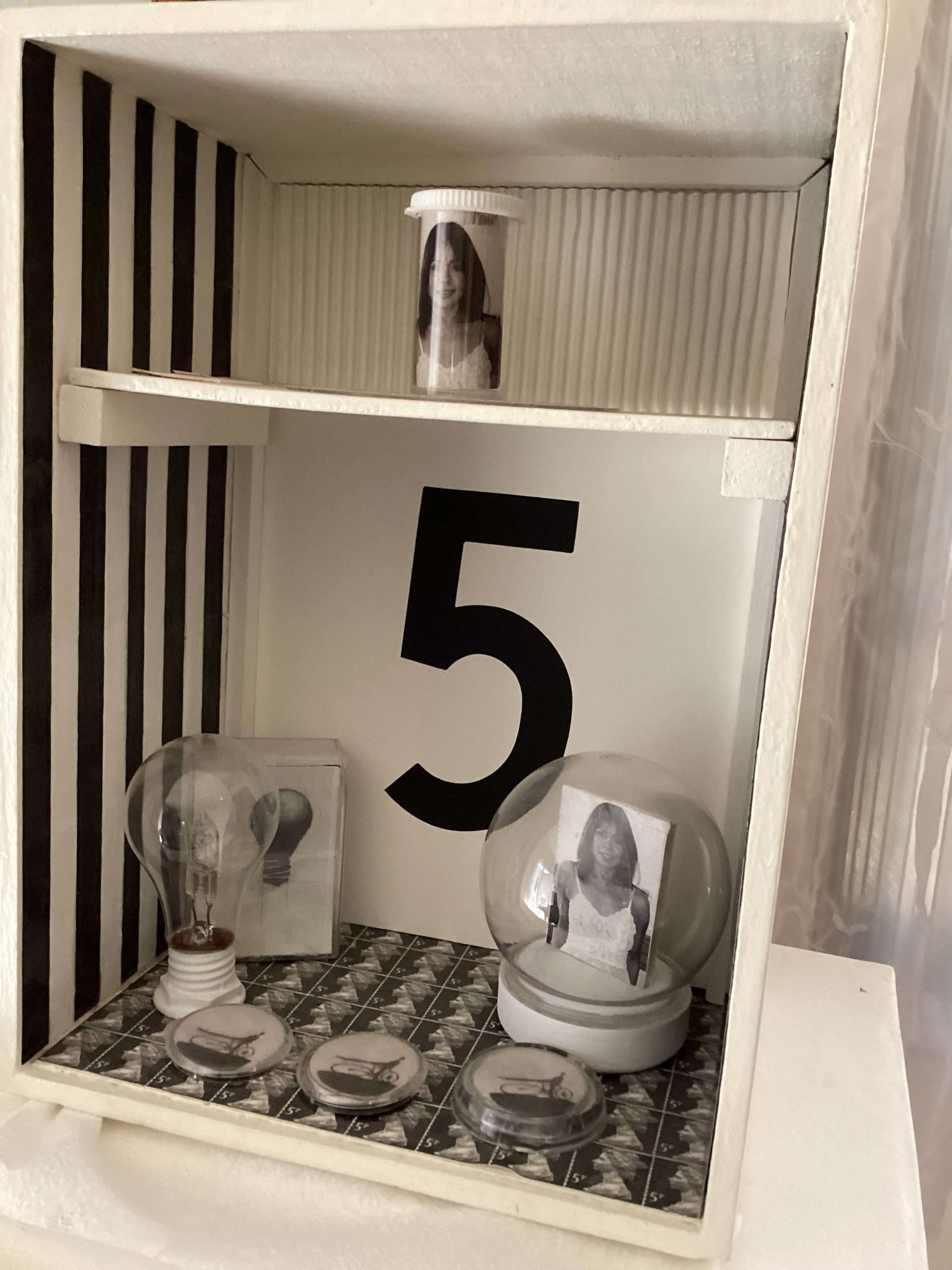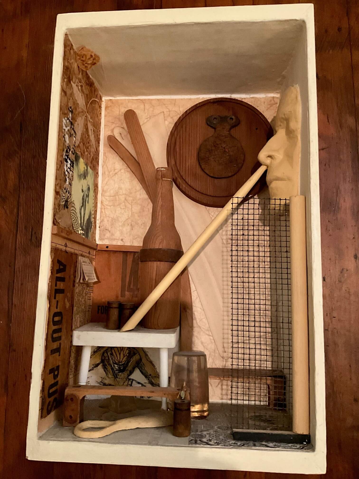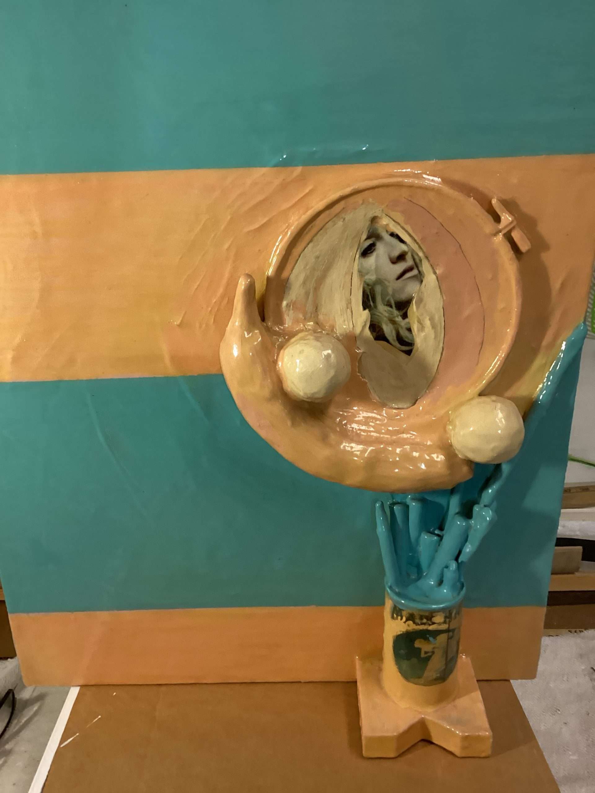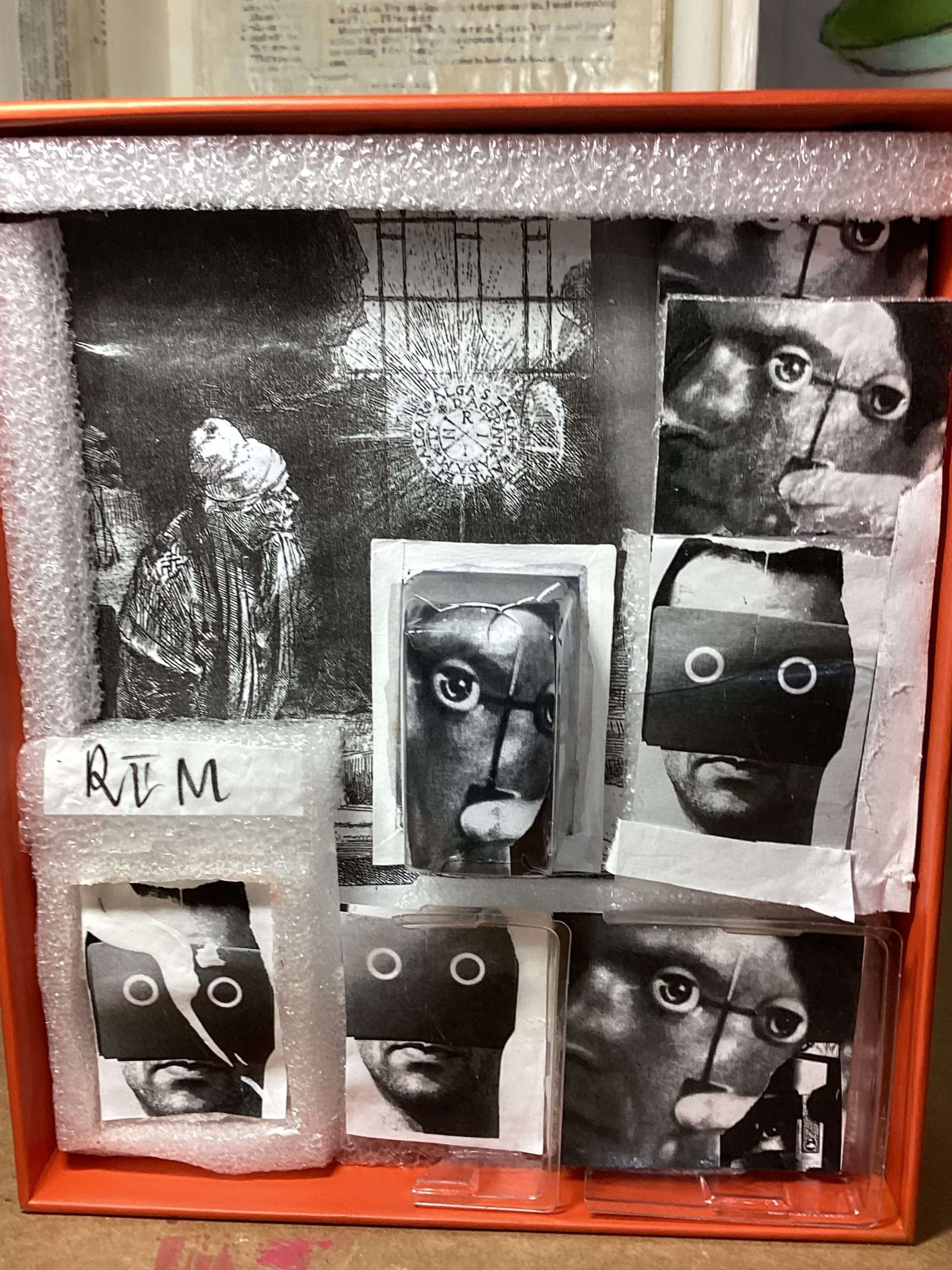 Other box elements explained: “plaster face mask” is of me. It was created with the help of Mark McCloud a San Francisco artist. The “straw” is a Charlie Watts (RIP) drumstick.